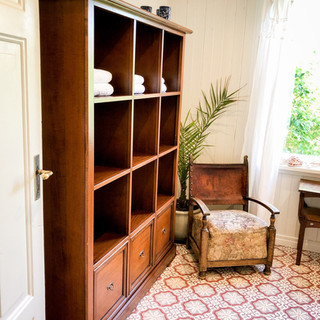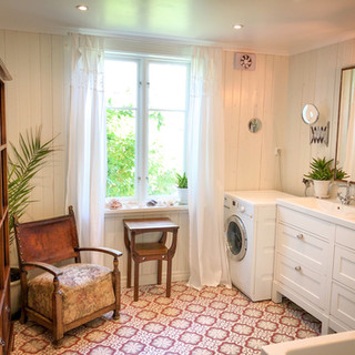 I går fikk jeg i hus et møbel jeg tror våre leieboere vil sette pris på. En stor hylle der man får hvert sitt rom til toalettmappe, føner etc! Min erfaring når vi er mange i huset er at det kan bli litt kaotisk på badet, toalettmapper litt over alt, på vasken, vaskemaskinen div sjampoer og såper på badekarkanten. Det er det nå slutt på takket være snille folk i Lotsvägen som sjenket oss dette superpraktiske møbel 🥰 Jeg vet ikke om det er andre enn meg som bruker stolene på badet, men jeg hadde i mitt tidlige voksenliv en stol på badet. Der satt min kjæreste på den tiden og leste for meg mens jeg badet, og jeg husker jeg fikk følelsen av å være på et Hamam. Å bade skal ikke bare være rengjøring av kroppen, men skal gi en skikkelig avslapning både fysisk og mentalt, synes jeg. Å kunne sette seg ned og slappe av etter badet mens man smører seg inn med deilige kremer er ikke å forakte, så derfor har jeg beholdt én av stolene. Kanskje jeg burde legge inn et par bind av 1001 natt for å oppfordre til kjærestelesing i baderommet...? 😉